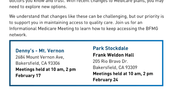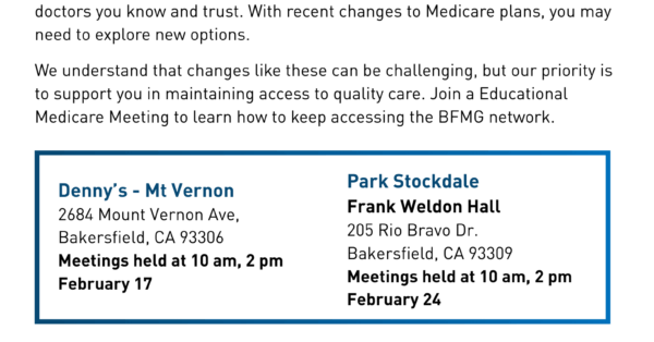 We understand that changes like these can be challenging, but our priority is to support you in maintaining access to quality care. Join us for an Informational Medicare Meeting to learn how to keep accessing the BFMG network.